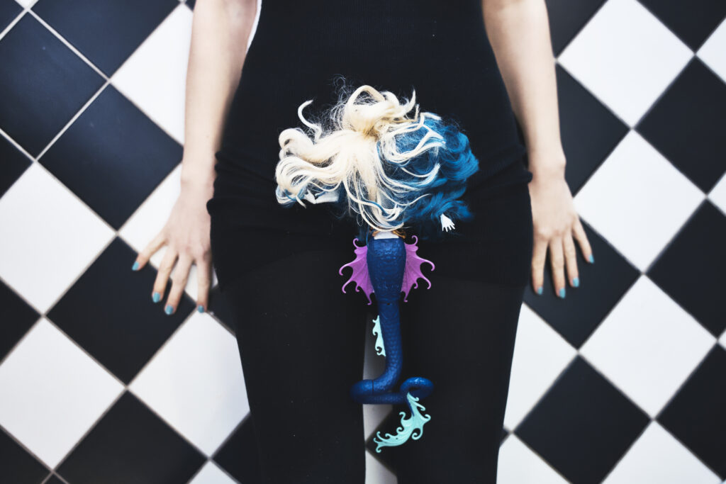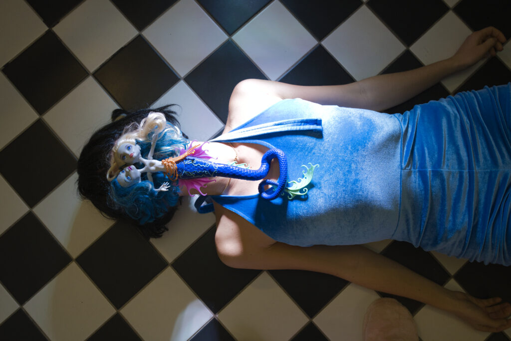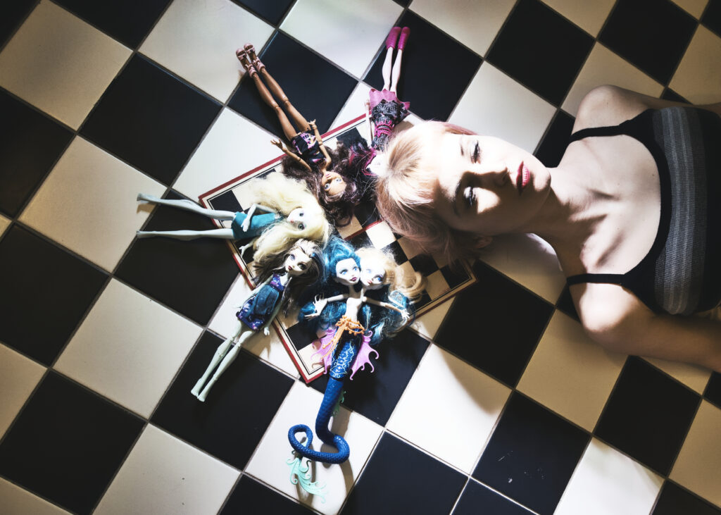 Für die Ausstellung Übergangsobjekte haben Karoline Schaugg und ich mit Monster High-Puppen gearbeitet – Objekte, die in ihrer popkulturellen Aufladung zwischen Kindheit, Konsum und Identität changieren. Wir fotografierten sie einzeln, in Paaren und in Interaktion mit uns selbst. Die großformatigen, farbintensiven Drucke wurden in einem kleinen Raum installiert: an Wänden und teilweise am Boden, sodass ein fragmentiertes, körpernahes Bildfeld entstand. Ergänzt wurde die Installation durch ein Video, in dem aus einer Serie von Fotografien ein dialogisches Spiel zwischen mir und den Puppen sichtbar wird.